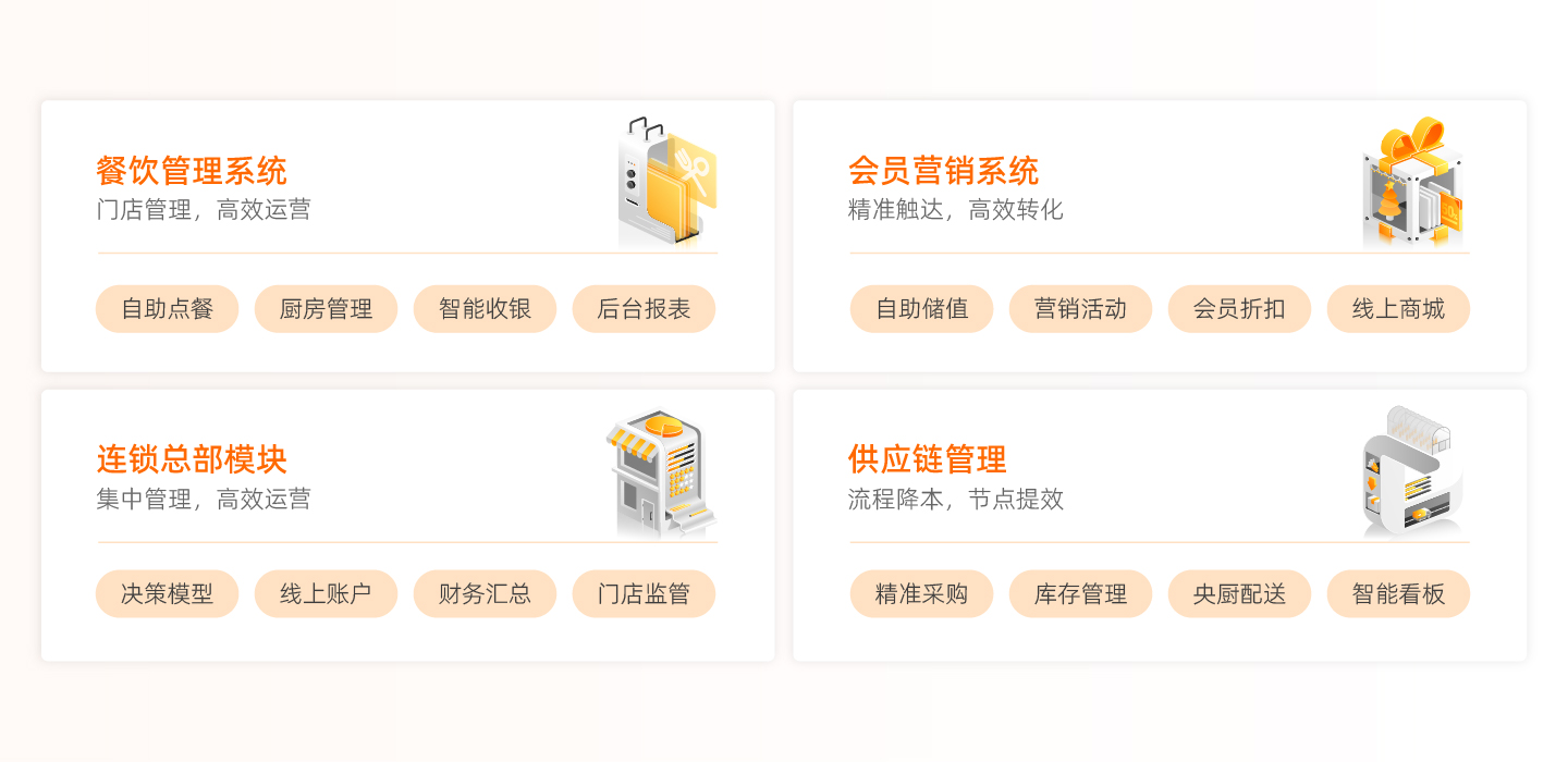 智能運(yùn)營層:聚合掃碼點(diǎn)餐/移動支付/桌臺管理于一體;效率提升層:廚房顯示系統(tǒng)(KDS)/智能分單/庫存預(yù)警;數(shù)據(jù)驅(qū)動層:會員精準(zhǔn)畫像/動態(tài)定價模型/BI可視化看板; 供應(yīng)鏈協(xié)同層:從采購預(yù)測到成本核算的全鏈路數(shù)字化。