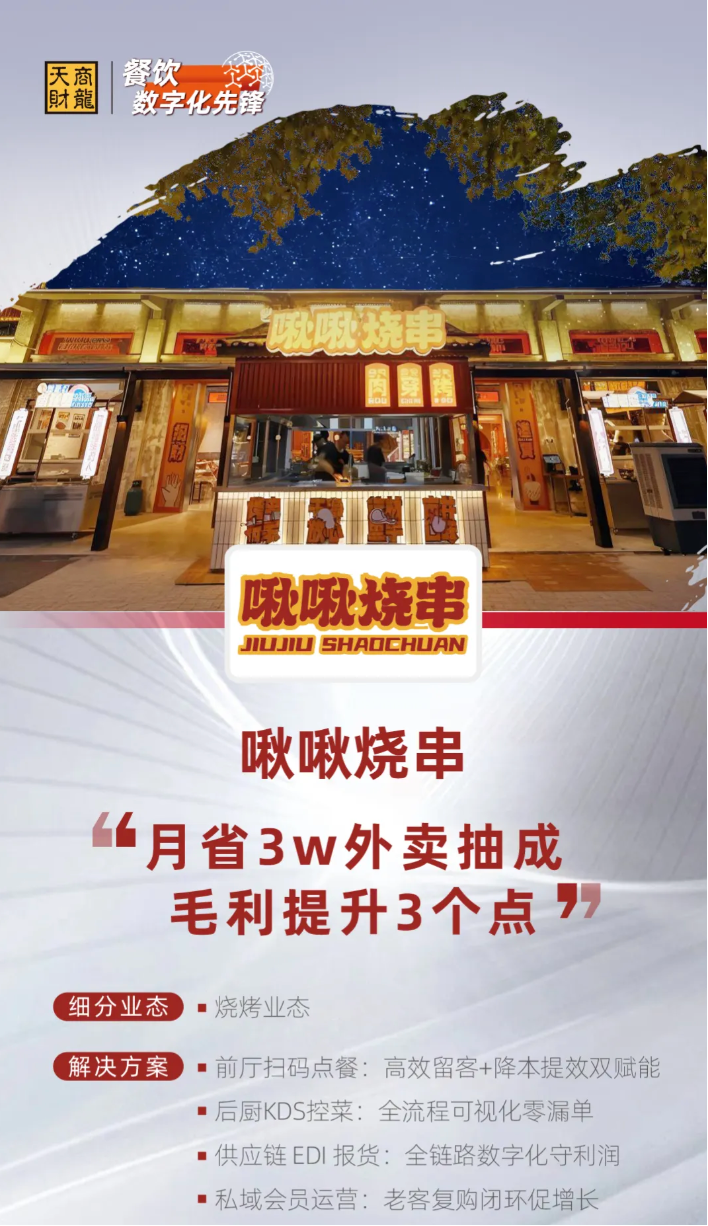 從掃碼點(diǎn)餐到智能后廚,從供應(yīng)鏈管控到私域深耕,「啾啾燒串」通過天財(cái)商龍的數(shù)字化工具,在每個(gè)運(yùn)營(yíng)場(chǎng)景都實(shí)現(xiàn)了效率提升與成本優(yōu)化。