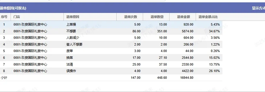 退菜原因數(shù)據(jù)化:分析前廳退菜原因,系統(tǒng)自動記錄退單次數(shù)、金額及具體原因(如上菜慢、菜品質量、客戶臨時變更等),幫助餐廳全面定位退菜根源,針對性改進流程。