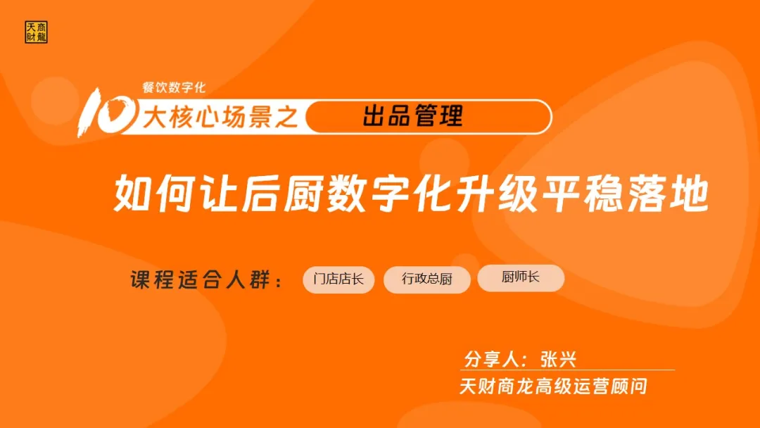 本次天財商龍餐飲研究院10大核心場景系列課程,高級運營顧問張興老師,就以后廚數(shù)字化落地的視角,為您盤點落地過程中的常見問題和解決方案,幫助您找到落地細(xì)節(jié)的每一個解法,助力系統(tǒng)順利落地!