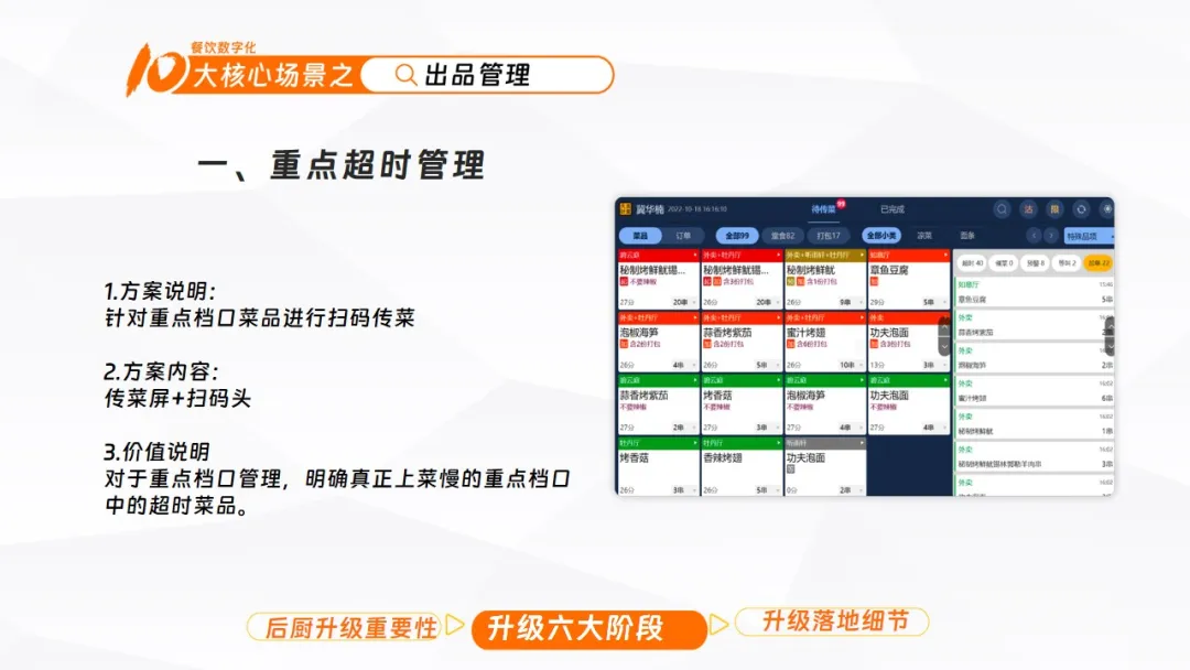所以,正確的做法,是要對以往因為“上菜慢”導(dǎo)致退菜、經(jīng)常被前廳催菜的菜品進(jìn)行“重點超時管理”。