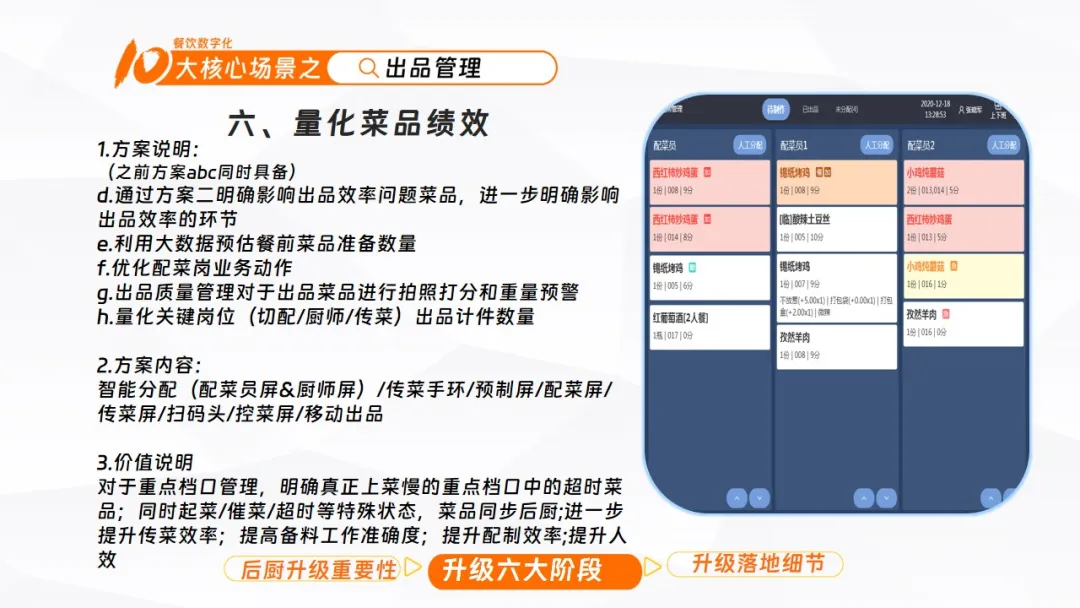量化出品的績效管理是一個非常復(fù)雜的過程,并不是某個菜得提成想訂一元就訂一元,它是需要大量的運營工作、數(shù)據(jù)測算的工作在里面的,以保障這個制度平穩(wěn)進(jìn)行落地。因此希望更多的餐飲門店先通過KDS把效率提升,把質(zhì)量控好,不要一上來就通過計件進(jìn)行人效管理。