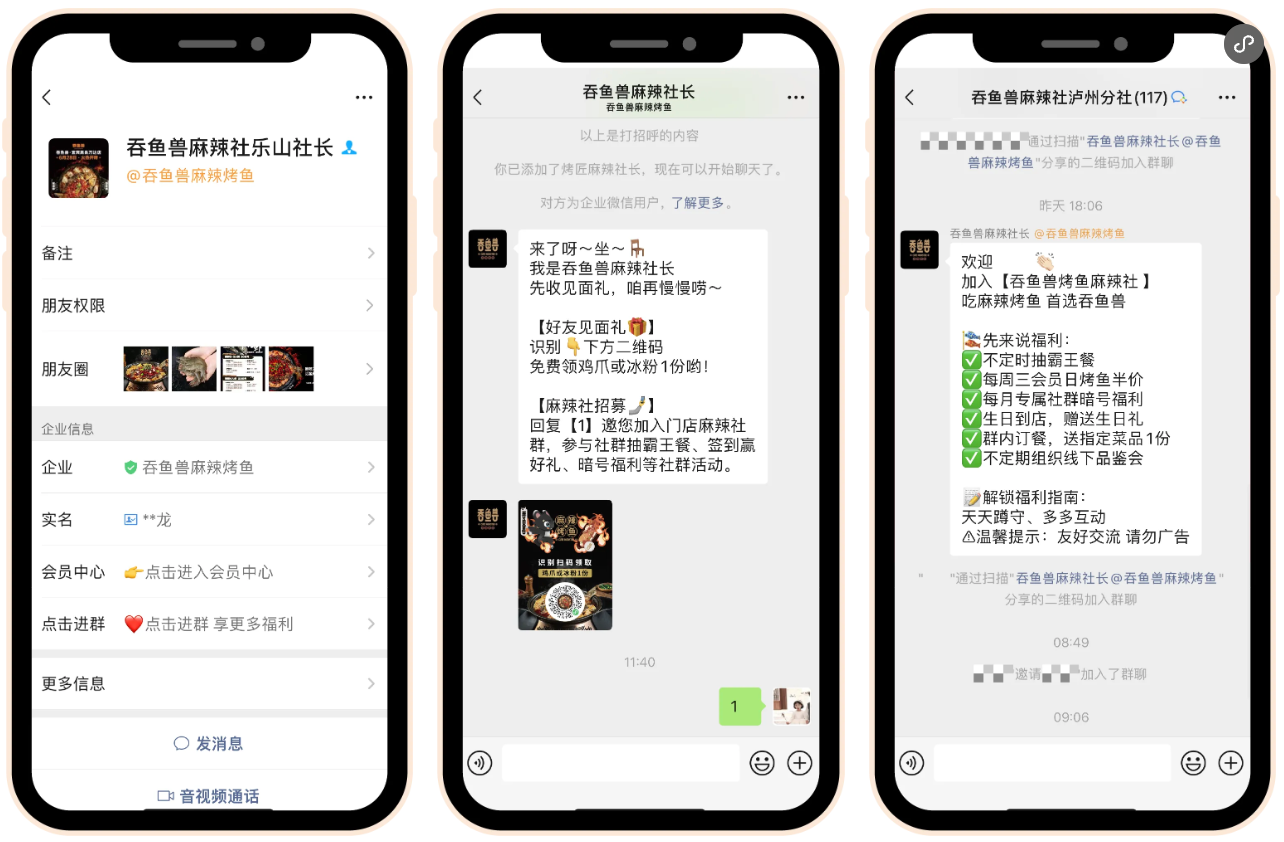 企微標(biāo)準(zhǔn)搭建:從基礎(chǔ)形象到溝通規(guī)范,搭建標(biāo)準(zhǔn)化企微運(yùn)營體系。統(tǒng)一設(shè)置企微頭像、昵稱、背景圖、個性簽名;制定1v1歡迎語和群歡迎語,如“進(jìn)群可參與霸王餐抽獎、每周三會員日烤魚半價”。