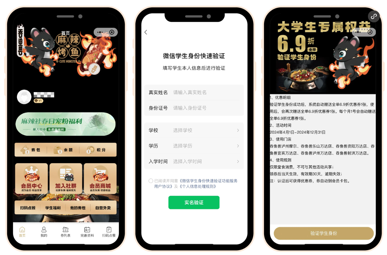 吞魚獸麻辣烤魚6家門店打通微信學(xué)生卡對接,串聯(lián)身份驗(yàn)證、自動贈券、多渠道宣發(fā)流程,搭建了從觸達(dá)到轉(zhuǎn)化的完整學(xué)生營銷場景,提升運(yùn)營效率。
