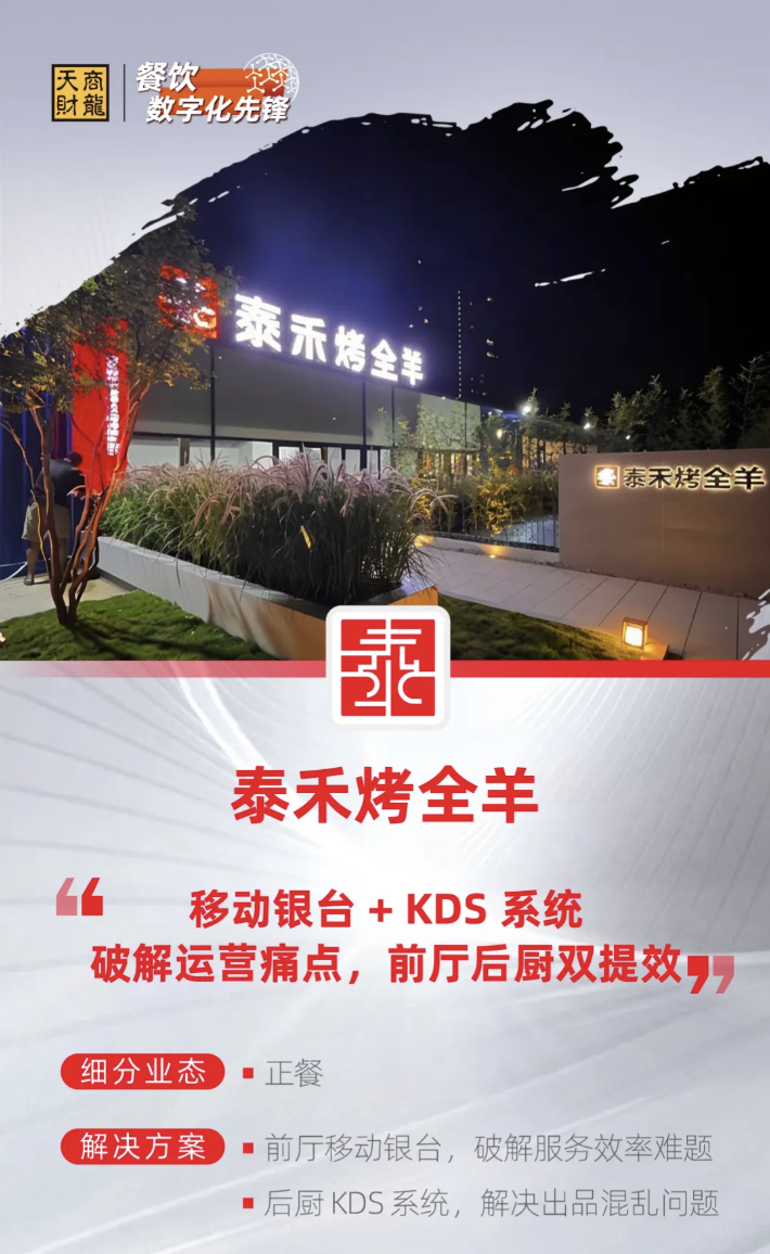 泰禾烤全羊的數(shù)字化轉(zhuǎn)型,是正餐特色菜業(yè)態(tài)應(yīng)對(duì)規(guī)模擴(kuò)張、提升運(yùn)營(yíng)效率的典型實(shí)踐。通過(guò)與天財(cái)商龍合作,成功落地前廳移動(dòng)銀臺(tái)、后廚 KDS 系統(tǒng)兩大核心場(chǎng)景功能,解決了原有 “點(diǎn)餐收銀系統(tǒng)”“廚房管理系統(tǒng)”適配不足的問(wèn)題,實(shí)現(xiàn)了服務(wù)效率與出品質(zhì)量的雙重提升。