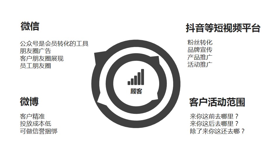 因此我們需要掌握這個平臺乃至各種互聯(lián)網(wǎng)工具的運(yùn)營方法,這樣才能切實(shí)通過這些平臺達(dá)到我們增大客流量,、提升客單價、提升復(fù)購率的營銷目的。
